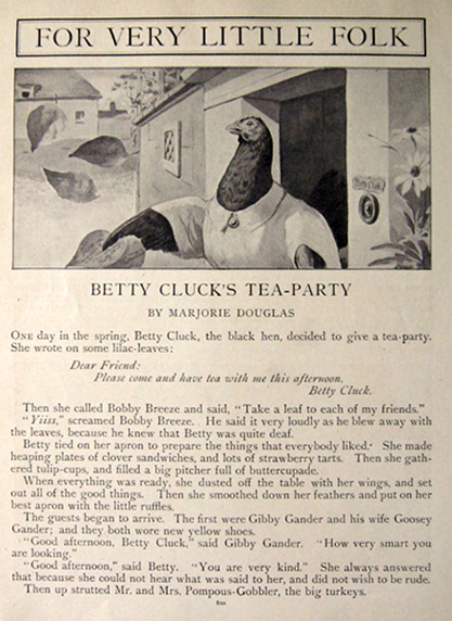 This is "Betty Cluck's Tea Party," For Very Little Folk. A children's story that has been carefully extracted from an old issue of St. Nicholas Magazine. Written by Marjorie Douglas with delightful illustrations by L.J. Bridgman.