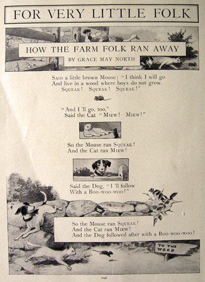 This is "How the Farm Folk Ran Away," For Very Little Folk. A children's story that has been carefully extracted from an old issue of St. Nicholas Magazine. Written by Grace May North with delightful illustrations by L.J. Bridgman. Tells the story of the farm animals who tried to run away only to be shooed back by the Old Farmer.