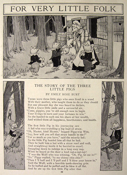 This is "The Story of the Three Little Pigs," For Very Little Folk. A children's story that has been carefully extracted from an old issue of St. Nicholas Magazine. Written by Emily Rose Burt, with charming illustrations by Mabel Betsy Hill.