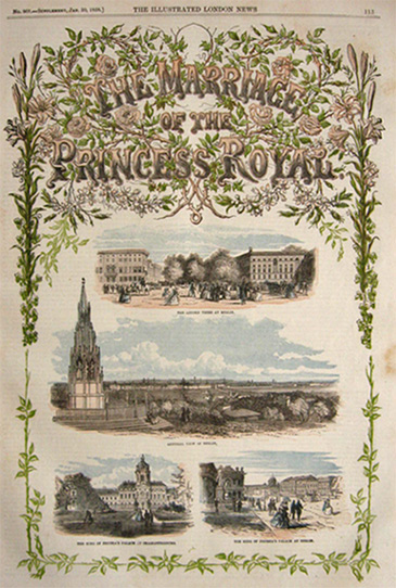 This is an original 8 page supplement that was removed from an 1858 issue of The Illlustrated London News. Over 150 years old, it includes the following: Front page color print depicting the Linden Trees at Berlin, General View of Berlin, the King's Palace at Charlottenburg and the palace at Berlin; large center spread with sheet music for "A Bridal Song" with lovely color designs at top and bottom; back page color engraving of their Royal Highnesses Frederick William and the Princess Royal; 4 pages of text that details the wedding. This is the entire 8 page supplement.