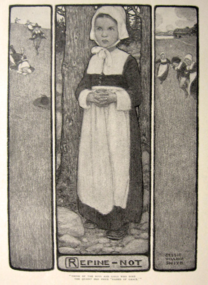This is a b&w Jessie Willcox Smith print that has been carefully extracted from an old issue of St. Nicholas Magazine. The print comes with the accompanying verse "Little Puritans" written by Ethel Parton.