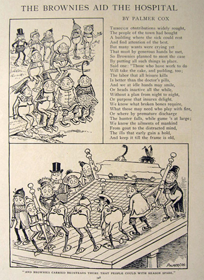 This is "The Brownies Aid the Hospital" illustrated verse by Palmer Cox featuring the beloved Brownies that has been carefully extracted from an old issue of St. Nicholas Magazine.