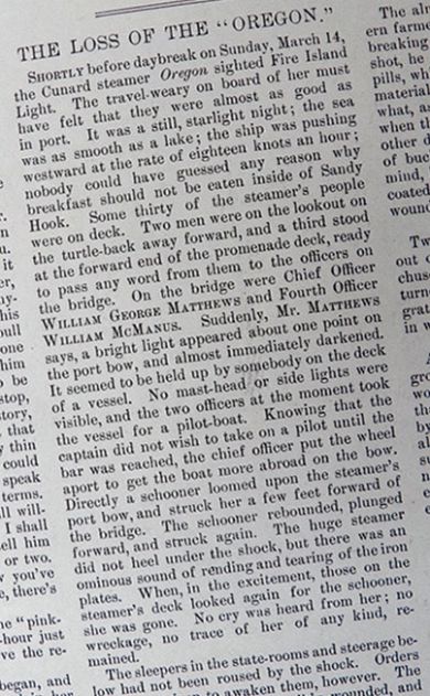 Original 19th century wood engraving removed from an 1886 issue of Harper's Weekly. Large two page print depicts the sinking of the S.S. Oregon. The article detailing the loss is on the reverse side.