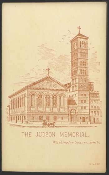 Description: This is an original card announcing Special Religious Services at the Memorial Baptist Church (Judson Memorial) with Pastor Edward Judson preaching. Reverse side contains an illustration of the church, which was located at Washington Square in NYC. Card announces "All seats free," and "Strangers Welcome." Dated from somewhere between the late 1890's and early 1910's.
