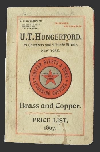 Original 1897 Brass & Copper Catalog & Price List from U.T. Hungerford in NYC. Partially illustrated in b&w.