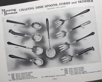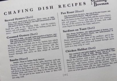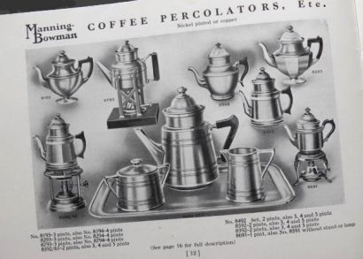 Original Manning Bowman booklet containing a catalog of items as well as recipes. Includes Percolators, Tea Ball Tea Pots/Urns, Casserole/Baking Dishes, Chafing Dishes and Chafing Dish accessories, and more. Undated, but most likely circa 1910's.