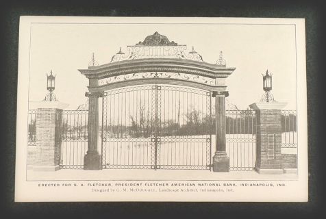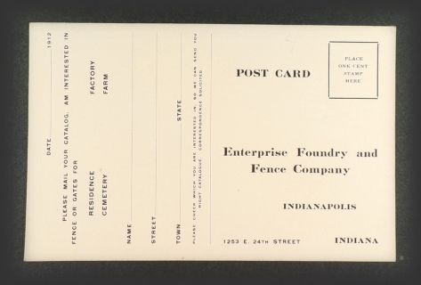 Description: Original advertising postcard from Enterprise Foundry and Fence Company in Indianapolis, Indiana. The postcard is dated 1912 and is unused. The pictures side has a photo of a fence erected for S.A. Fletcher, President of Fletcher American National Bank