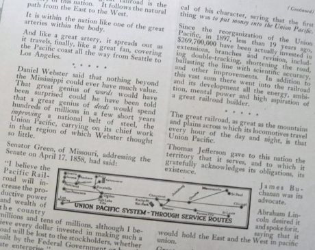 Tagline or sample ad copy: The Union Pacific is one of the great industrial triumphs of republican government, the result of individual initiative, combined with wise government interest and cooperation.