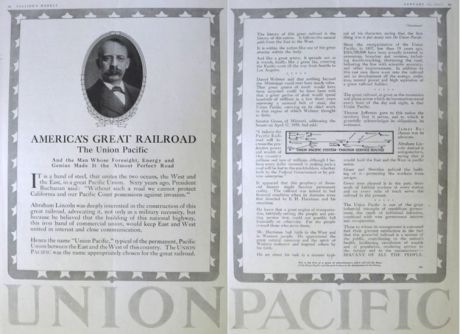 Original vintage magazine ad for the Union Pacific Railroad. This was the first of a series of advertisements that told the story of the Union Pacific and the part it played in the development of the nation. This is a two page ad in two pieces.