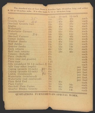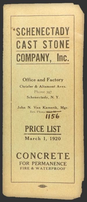 Description: Original 1920 folded price list from the Schenectady Cast Stone Company in Schenectady NY.