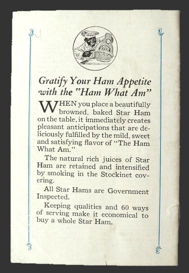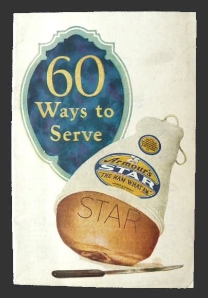 Original recipe booklet: 60 Ways to Serve Armour's Star Ham. Undated, but most likely published in the late 1920's. With color illustrations throughout.
