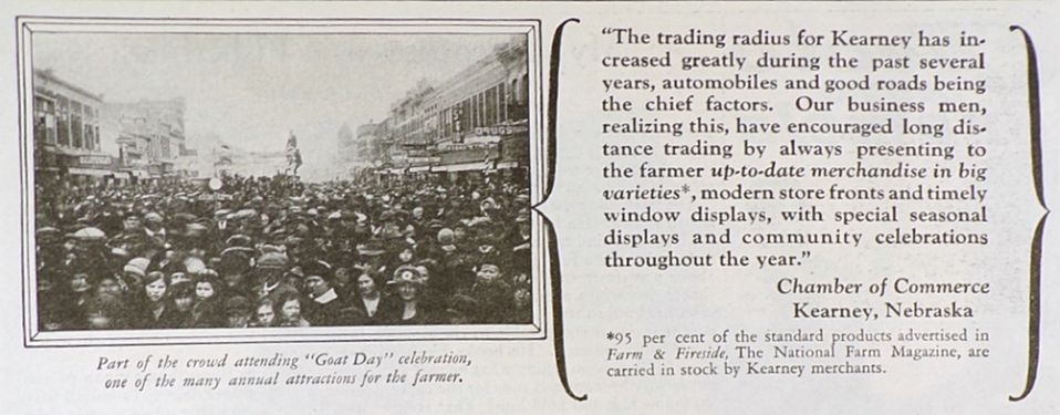Original vintage magazine ad promoting a sales plan for business people in Kearney Nebraska. Ad text touts the sales generated from Farm & Fireside Magazine. The people of Kearney (because they were "hustlers") sold farmers all over Buffalo County the idea of coming to Kearney to buy goods. The result of that was that in the previous year "seventy percent of Kearney's total retail trade was farm business." They go on to say "Good roads and the automobile have brought hundreds of new customers within easy trading distance of their stores."