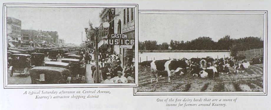 There are three small photos: A typical Saturday on Central Avenue (Gaston Music sign is near the forefront); one of five dairy herds that are a source of income in Kearney; part of a crowd attending the "Great Day" celebration.