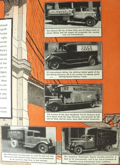 Original vintage magazine ad for International Trucks. With great photos of some old trucks including a truck from the Vacuum Oil Co., Cox's Cakes (Cox Baking Company), Aero Mayflower Transit, Washington Square Laundry, and a Coke Coal truck.