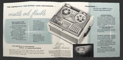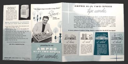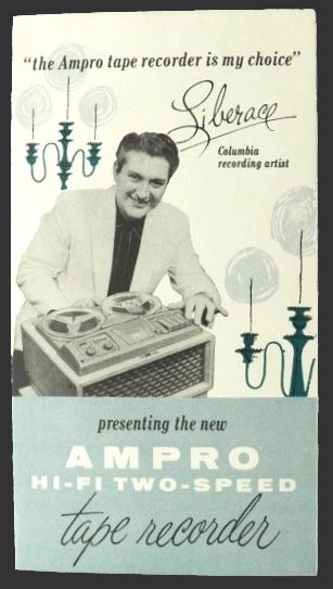 Original folded advertising pamphlet for Ampro Tape Recorders featuring Model 757 and 757-T. With Liberace on the cover. Undated, but circa 1950's.