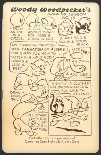 Description: These collectible cards were give out in boxes of Carnation Corn Flakes and Albers Oats. This one -- rom 1953 -- teaches us how to draw Snuffy Skunk (Woody Woodpecker's Drawing Lesson No. 15).
