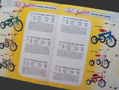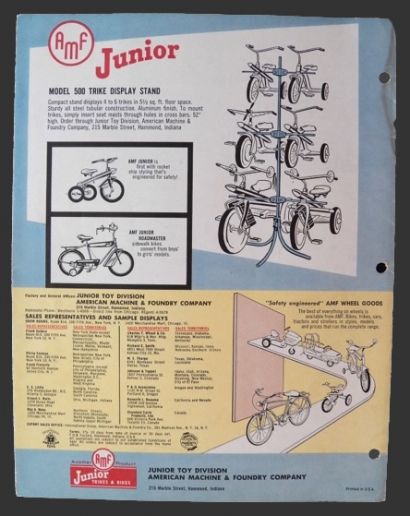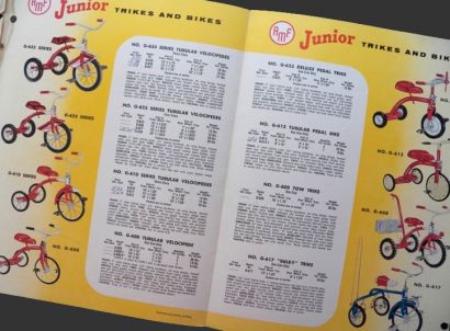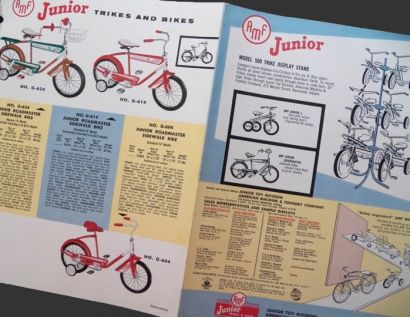 Original 1957 brochure for AMF bikes and trikes. Folded brochure appears to be for wholesalers with specs, model numbers, descriptions, and weight per carton. Prices are blank, but a few have been noted with a pen. 4 folded pages printed on back and front (for a total of 8 pages). With Junior Trikes, Tubular Velocipedes, Pedal Trike, Tow Trike, "Sulky" Trike, Roadmaster models, and display stand for the bicycles.