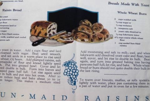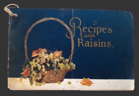 Original antique Sunmaid Raisins recipe booklet: "Recipes with Raisins." Undated but most likely mid 1920's. Includes breads, puddings, salads, desserts, cakes & cookies, confections, and more. With color illustrations throughout.
