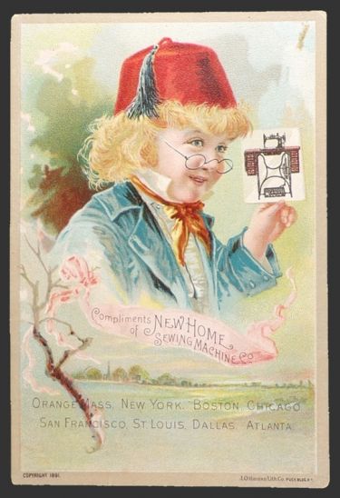 Description: Antique Victorian trade card dated 1891. A person (man?) with a fez hat holds up a card with an image of a sewing machine.