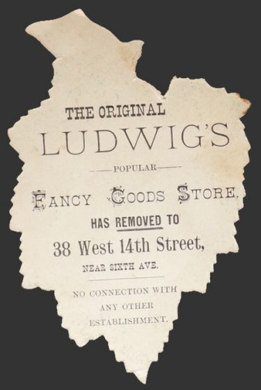 Advertising Text (reverse): The Original Ludwig's Popular Fancy Goods Store has removed to 38 West 14th Street Near Sixth Avenue