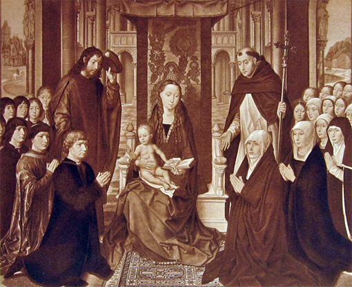 In the center is the Virgin, facing us, seated on a marble throne, behind which is hung a brocaded cloth of honor. The Child is sitting on her right knee with His left hand on an open book, which she holds with hers. On the right and left of the throne are two symmetrical groups of figures facing slightly towards it; on the right (our left) St. James stands behind the kneeling figure of the donor, as though presenting him to the Holy Child, and behind them are seven other kneeling figures. On the opposite side St. Dominic presents the wife of the donor, behind whom twelve women are kneeling.