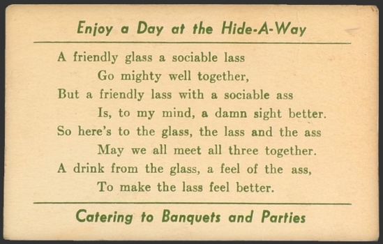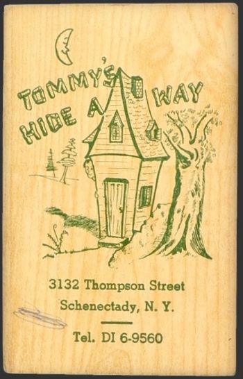 Description: This is a nice old illustrated business card from Tommy's Hideaway in Schenectady NY. The phone number on the card still has letters which would make this some time before the 1950's. Reverse side contains a somewhat bawdy poem dealing with a "lass" and an "ass."