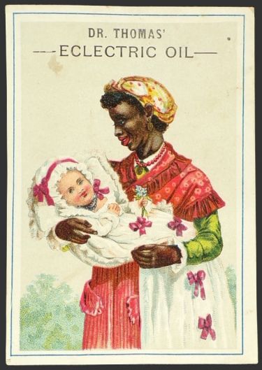 Description: Antique Victorian trade card. Quack medicine. Front shows black nanny gazing lovingly at a baby she is holding.
