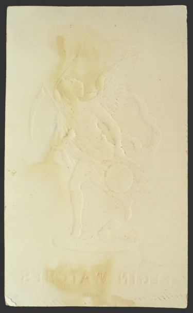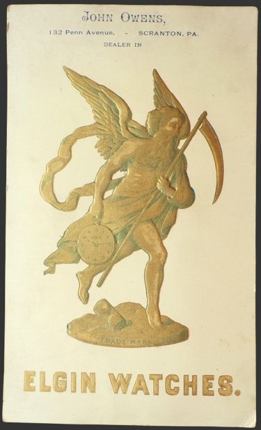 Description: Antique Victorian trade card. Elgin Watches large size embossed card. Father time. Sold by John Owens, 132 Penn Avenue, Scranton, PA. Reverse is blank.