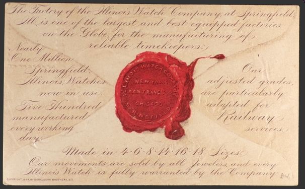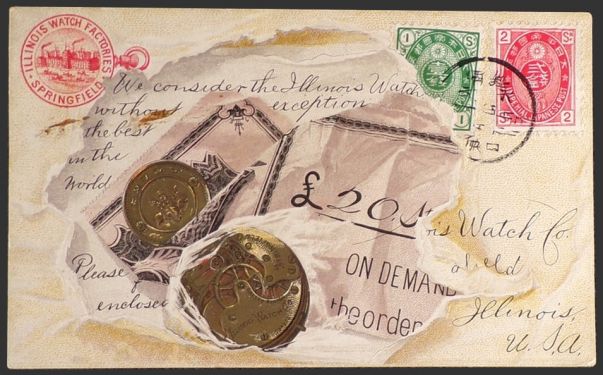 Description: Antique Victorian trade card dated 1889. Illinois Watch Company, Springfield. With embossed images of Japanese stamps and a Japanese postmark