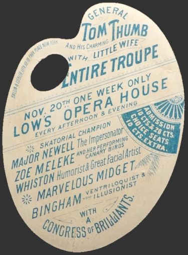 Advertising Text (reverse): General Tom Thumb and his charming Little Wife, Entire Troupe, Nov. 20th one week only Low's Opera House every afternoon & evening. Skatorial Champion, Major Newell The Impersonator, Zoe Meleke and her performing canary birds, Whiston Humorist & Great Facial Artist, Marvelous Midget, Bingham Ventriloquist & Illusionist with a Congress of Brilliants.