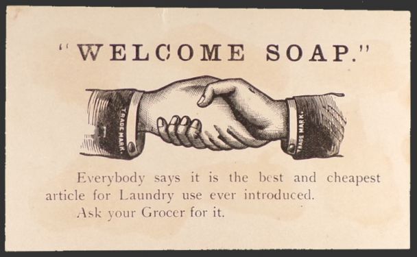 Advertising Text (reverse): "Welcome Soap: Everybody says it is the best and cheapest article for Laundry use ever introduces. Ask your Grocer for it.