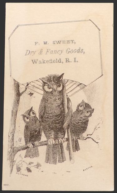 Description: Antique Victorian trade card. Stock card with image of three owls on a branch. Mama owl holds the sign.