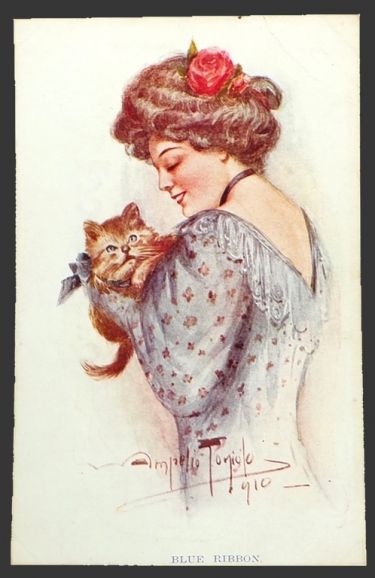 Description: Victorian woman holds a cat. Caption: "Blue Ribbons." Series P.214