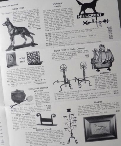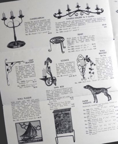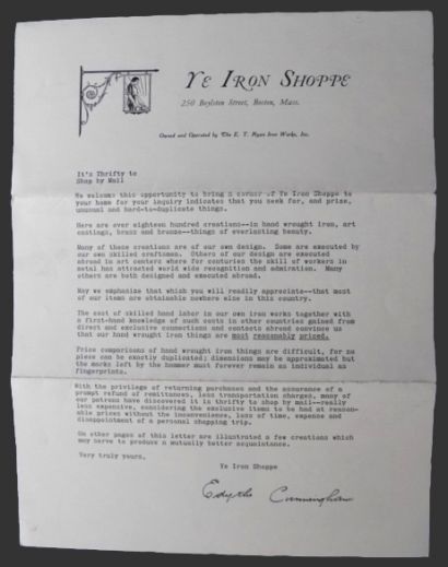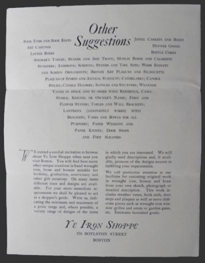 Original 4 page pamphlet from Ye Iron Shoppe (located at 250 Boylston Street, Boston MA), owned and operated by the E.T. Ryan Iron Works. Front page contains a letter with info about the business and the items they sell. The two interior pages contain illustrated examples of some of their creations including candelabrum, mail box, paper weights, andirons, weather vanes, door stops, and more. The back page contain a list of other items they sell. Undated, but judging by the prices (e.g.: $28 for a weathervane), we would estimate this to be circa 1930's.
