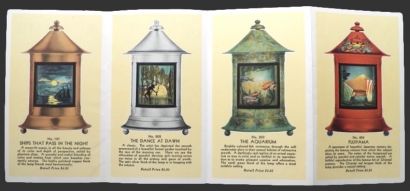 This is an original brochure for Revolite Picture Lamps from Williamson Manufacturing. Undated, but most likely from the 1950's. These lamps apparently revolved by means of the heated air around the lamp escaping out of the top of the inner sleeve. This folded brochure features the following styles: Ships That Pass in the Night; The Dance at Dawn; The Aquarium; Fujiyama; Venice; and Fairy Tale Folk.