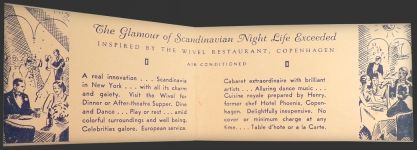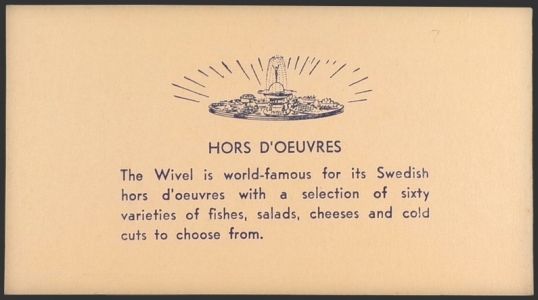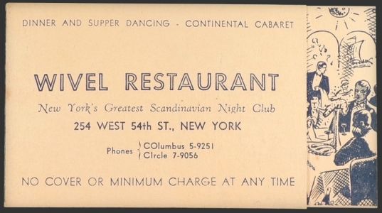 Description: Original vintage business card from Wivel Restaurant on 54th street in NYC. Probably circa 40's/50's. Card opens up to show an illustration of people dining and information about the restaurant. Back of card boasts of its world famous Swedish hors d'oeuvres.