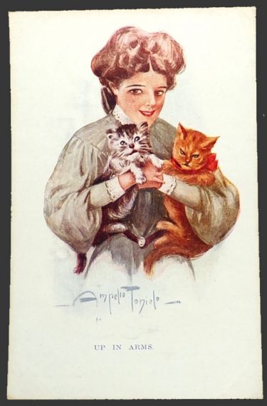 Description: Victorian woman holds two cats. Caption: "Up In Arms." Series P.214